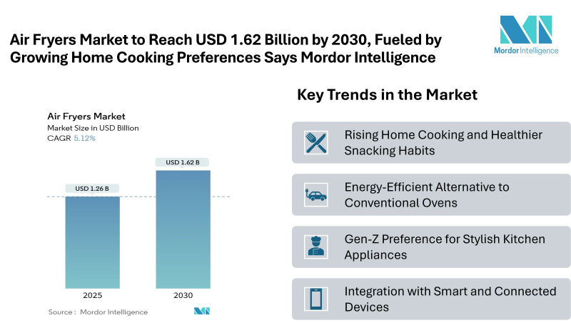 According to Mordor Intelligence, the global Air Fryers Market size stood at USD 1.26 billion in 2025 and is forecast to advance at a 5.12% CAGR, reaching USD 1.62 billion by 2030. The Air Fryers Market share is increasingly influenced by product innovations, including rapid-heat technology, PFAS-free coatings, and smart-home connectivity.