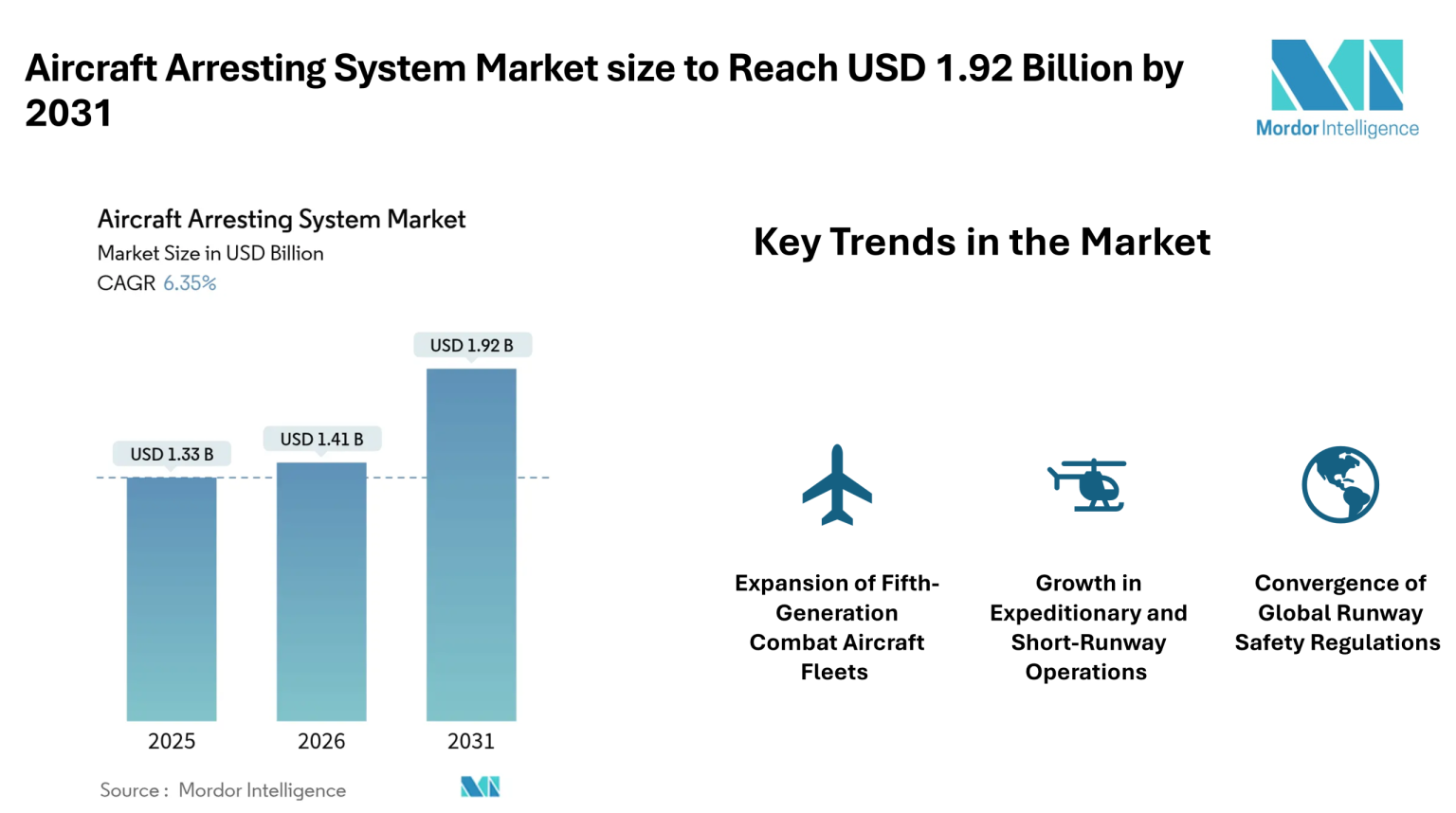 According to Mordor Intelligence, the aircraft arresting system market size was valued at USD 1.41 billion in 2026 and reach USD 1.92 billion by 2031, registering a CAGR of 6.35% during the forecast period. The aircraft arresting system market size is supported by rising investments in advanced fighter aircraft, aircraft carrier modernization programs, and stricter runway safety requirements across commercial airports.