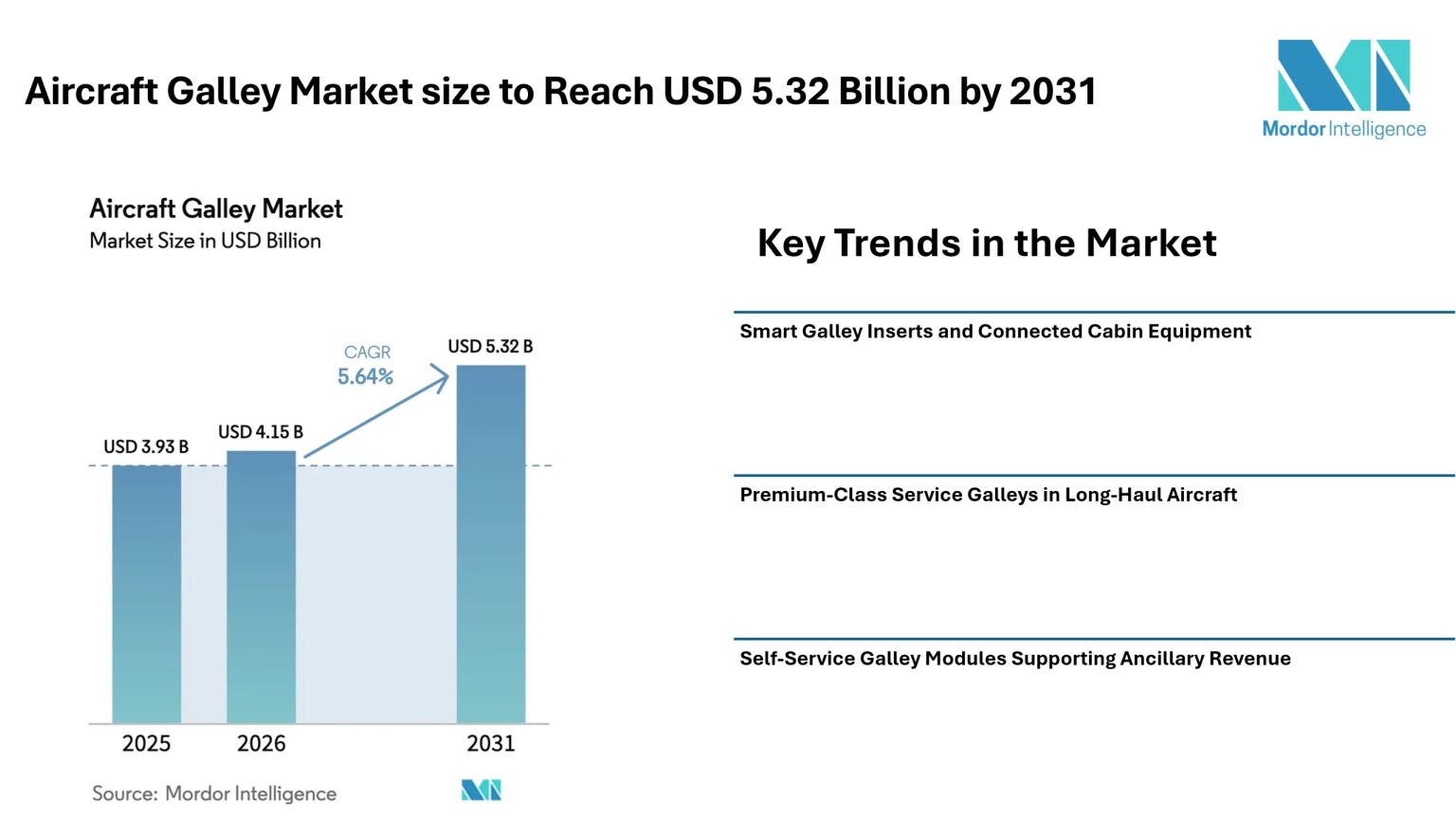 According to Mordor Intelligence, the aircraft galley market size is estimated at USD 4.15 billion in 2026, increasing from USD 3.93 billion in 2025, and projected to reach USD 5.32 billion by 2031, reflecting steady aircraft galley market growth during the forecast period. Airlines are directing post-pandemic investments toward cabin modernization, improved passenger services, and more efficient onboard catering infrastructure.