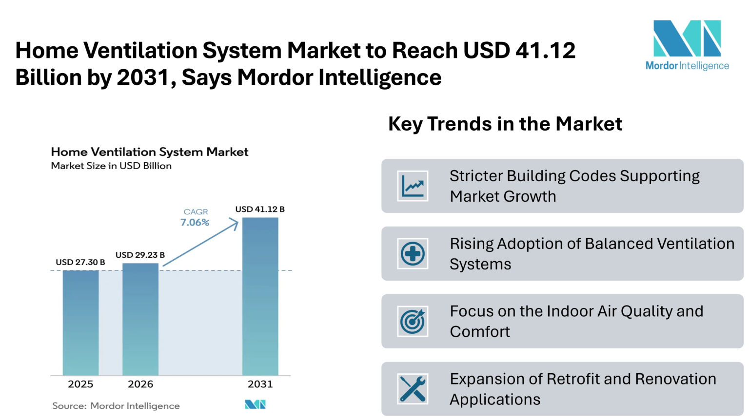 According to Mordor Intelligence, the home ventilation system market size is projected to grow from USD 27.30 billion in 2025 to USD 29.23 billion in 2026 and reach USD 41.12 billion by 2031, growing at a CAGR of 7.06%. This steady market growth reflects rising awareness around indoor air quality, along with stricter building standards that require better airflow management in residential spaces.