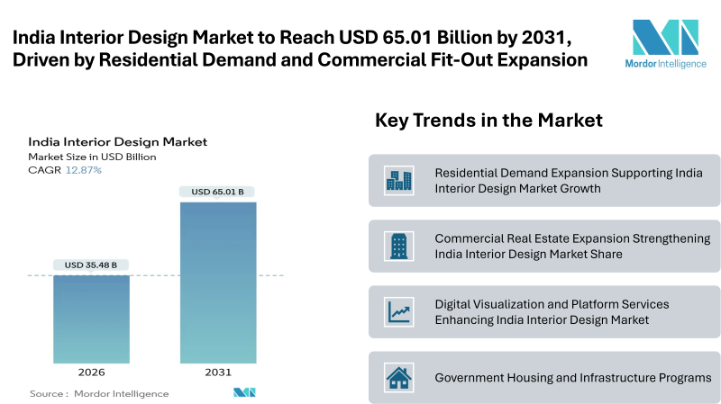 According to Mordor Intelligence, the India interior design market size is valued at USD 35.48 billion in 2026 and is projected to reach USD 65.01 billion by 2031, registering a CAGR of 12.87%. This steady India interior design market growth reflects increasing demand from residential housing, commercial spaces, and organized design platforms offering integrated solutions. The India interior design industry is witnessing rising adoption of modular layouts, turnkey packages, and branded interior systems across metro and non-metro cities.