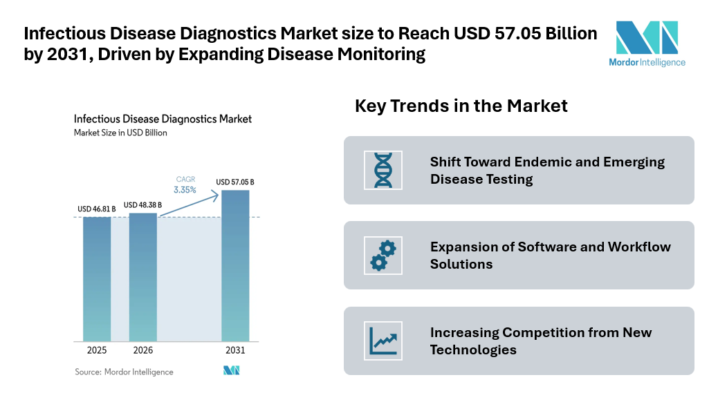 According to Mordor Intelligence, the infectious disease diagnostics market size was valued at USD 46.81 billion in 2025 and is expected to grow from USD 48.38 billion in 2026 to reach USD 57.05 billion by 2031, registering a CAGR of 3.35% during the infectious disease diagnostics market forecast period.