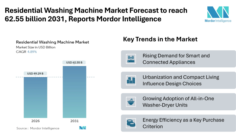 According to the Mordor Intelligence, the residential washing machine market size in the introduction phase reflects a clear upward path, with the market valued at USD 49.29 billion in 2026, rising from USD 46.99 billion in 2025, and projected to reach USD 62.55 billion by 2031, supported by a 4.89% CAGR during the forecast period.