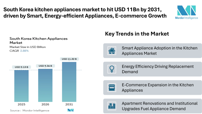 According to Mordor Intelligence, the South Korea kitchen appliances market size is witnessing steady expansion as households and institutions continue to upgrade appliances with connected features and higher energy-efficiency standards. According to industry analysis, the market is expected to increase from USD 9.13 billion in 2025 to USD 9.36 billion in 2026 and reach USD 11.32 billion by 2031, reflecting a CAGR of 3.88%.